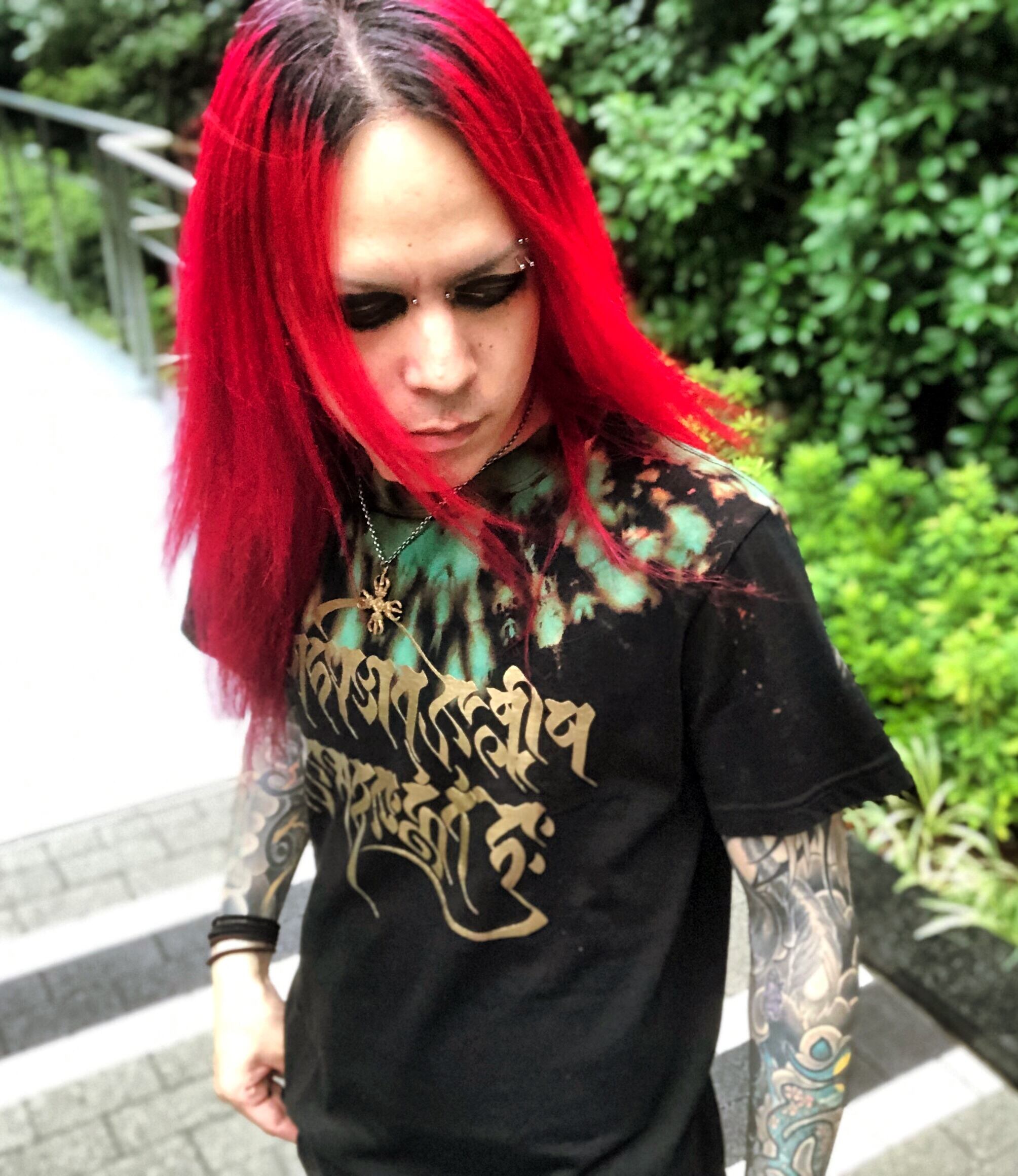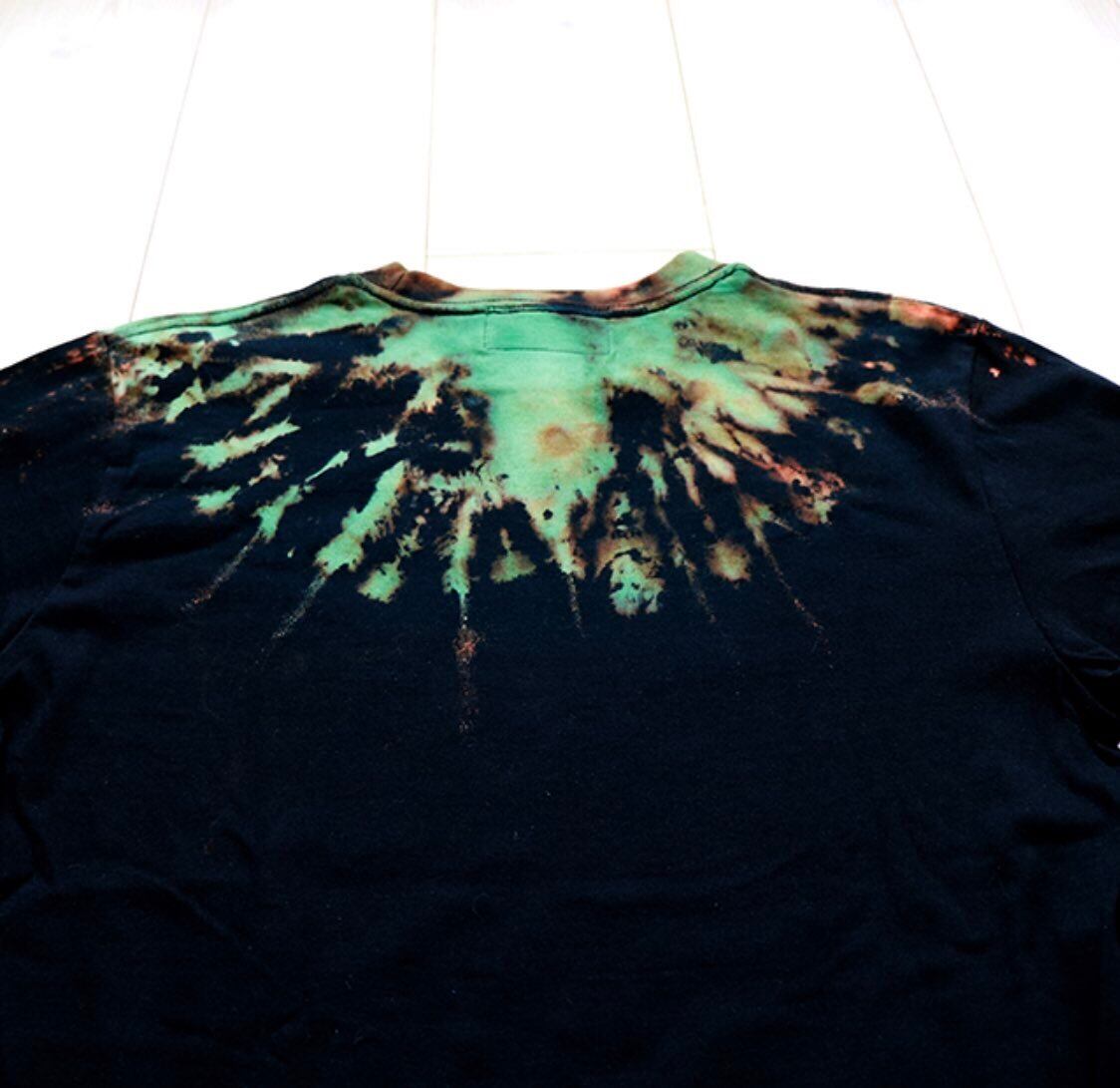 首回りにタイダイ染めを施し、胸に梵字(光明真言)を燻金色でプリントした、宇宙的でオリエンタルな世界観のアイテム。